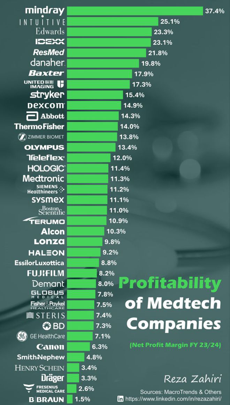 近日,LinkedIn(領(lǐng)英)公布了2023/2024全球醫(yī)療器械公司利潤率排名表。這張榜單展示了2023/2024財年全球主要醫(yī)療科技類公司的凈利潤率情況及排名。榜單上,排名前10的醫(yī)療科技公司分別為:邁瑞醫(yī)療、直覺醫(yī)療、愛德華、愛德士、瑞思邁、丹納赫、百特、聯(lián)影醫(yī)療、史賽克、德康,這些公司的凈利潤率均在14%以上,憑借較高的凈利潤率,往往在資本市場上也能獲得更高的市場估值,聚攏大量的資金。