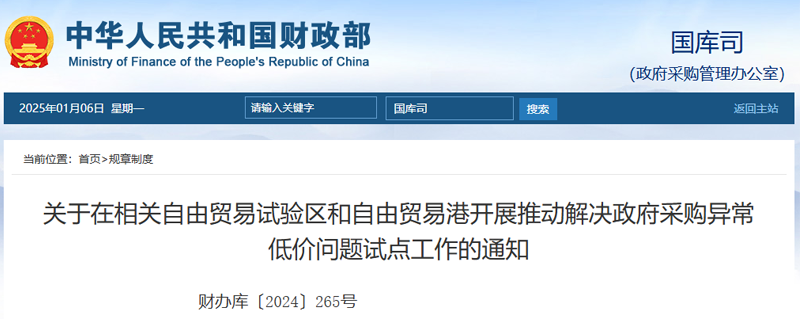 12月25日,國家財政部正式發布了《關于在相關自由貿易試驗區和自由貿易港開展推動解決政府采購異常低價問題試點工作的通知》(以下簡稱《通知》)?!锻ㄖ分赋觯簽榇龠M政府采購公平競爭,推進優質優價采購,財政部決定在北京、天津、上海、福建、廣東自由貿易試驗區和海南自由貿易港開展推動解決政府采購異常低價問題試點工作。