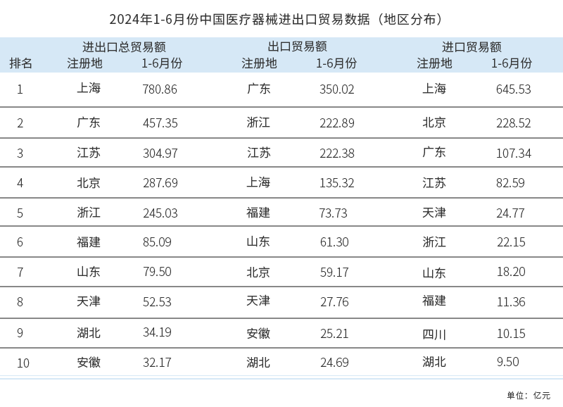 2024年1-6月份數(shù)據(jù)顯示,醫(yī)療器械進(jìn)出口總貿(mào)易額,上海、廣東、江蘇位居前三,為我國(guó)醫(yī)械進(jìn)出口貿(mào)易強(qiáng)省,三省市的貿(mào)易總額分別為780.85億元、457.35億元、304.97億元,合計(jì)占我國(guó)醫(yī)械進(jìn)出口貿(mào)易總額的61.02%。
