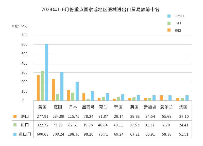 重點(diǎn)國(guó)家或地區(qū)貿(mào)易情況。根據(jù)2024年1-6月份總體數(shù)據(jù),中國(guó)醫(yī)療器械前三位的貿(mào)易伙伴為美國(guó)、德國(guó)和日本,中國(guó)對(duì)這三個(gè)國(guó)家的進(jìn)出口貿(mào)易額均在百億元以上,其中美國(guó)為600.63億元,德國(guó)為308.64億元,日本為198.36億元;中國(guó)對(duì)這三個(gè)國(guó)家的進(jìn)出口貿(mào)易總額合計(jì)為1107.23億元,占中國(guó)全球貿(mào)易總額的43.79%。從具體進(jìn)口與出口的對(duì)比數(shù)據(jù)來(lái)看,2024年1-6月份醫(yī)械貿(mào)易,中國(guó)對(duì)美國(guó)的出口額為322.72億元,出口額為277.91億元,實(shí)現(xiàn)順差44.81億元;而對(duì)德國(guó)、日本均為貿(mào)易逆差,貿(mào)易逆差額分別為161.54億元、33.14億元。此外,值得注意的是,在中國(guó)醫(yī)療器械前十位的貿(mào)易伙伴中,中國(guó)對(duì)其進(jìn)出口貿(mào)易實(shí)現(xiàn)逆差的國(guó)家還有墨西哥(58.28億元)、新加坡(3.17億元)、愛(ài)爾蘭(52.98億元)以及法國(guó)(2.69億元)。