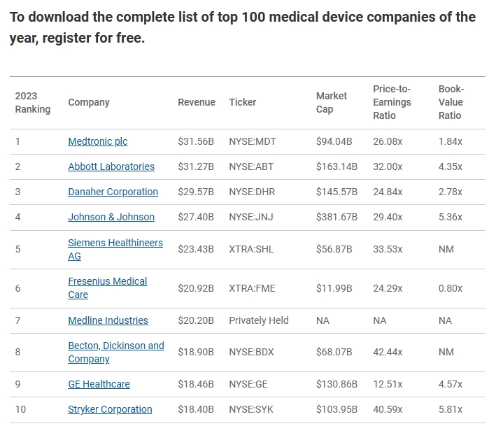 2024年3月,全球醫療器械行業極具影響力的刊物Mdedical Device + Diagnostic Industry(MD+DI),在其官方網站發布了2023年全球醫療器械企業TOP100榜單。