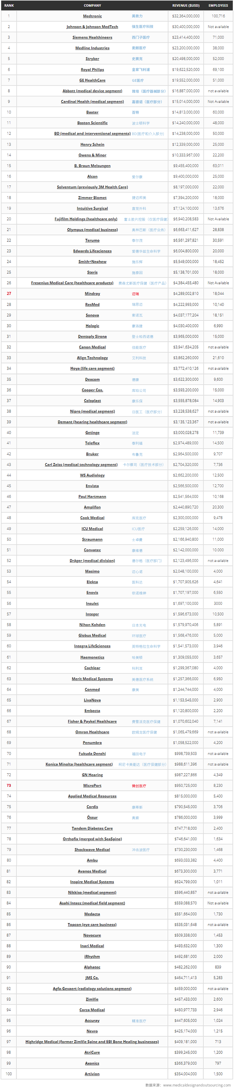 美敦力、強生、西門子依然穩居榜單前三名。排名前十的醫療器械巨頭企業,其銷售收入總額達2157億美元,占據整個百強企業銷售總額的45%,接近一半。我國仍然僅有邁瑞醫療、微創醫療兩家企業上榜,分別位列27名、73名,其中,邁瑞醫療位次與去年相同,微創醫療位次上升四位(去年為77名)。